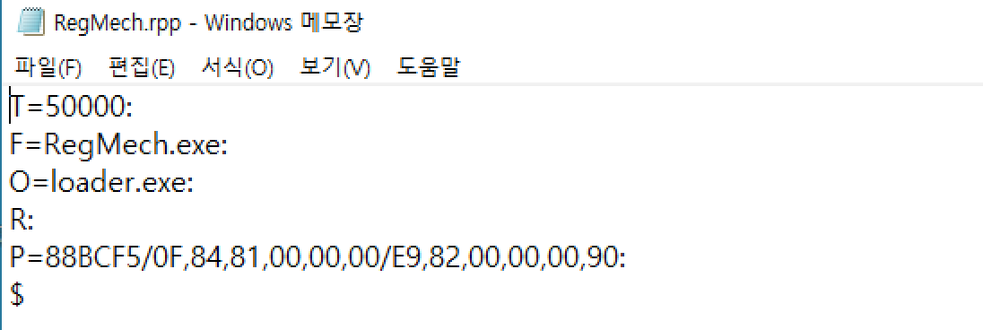 P는 패치 내용을 말하는데 주소값/원래 명령어/바꿀 명령어 순으로 써주면 된다.