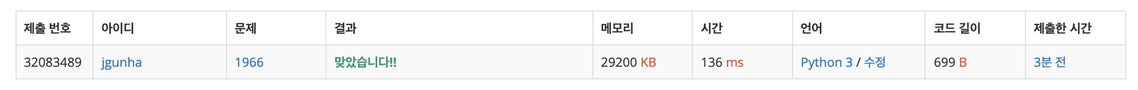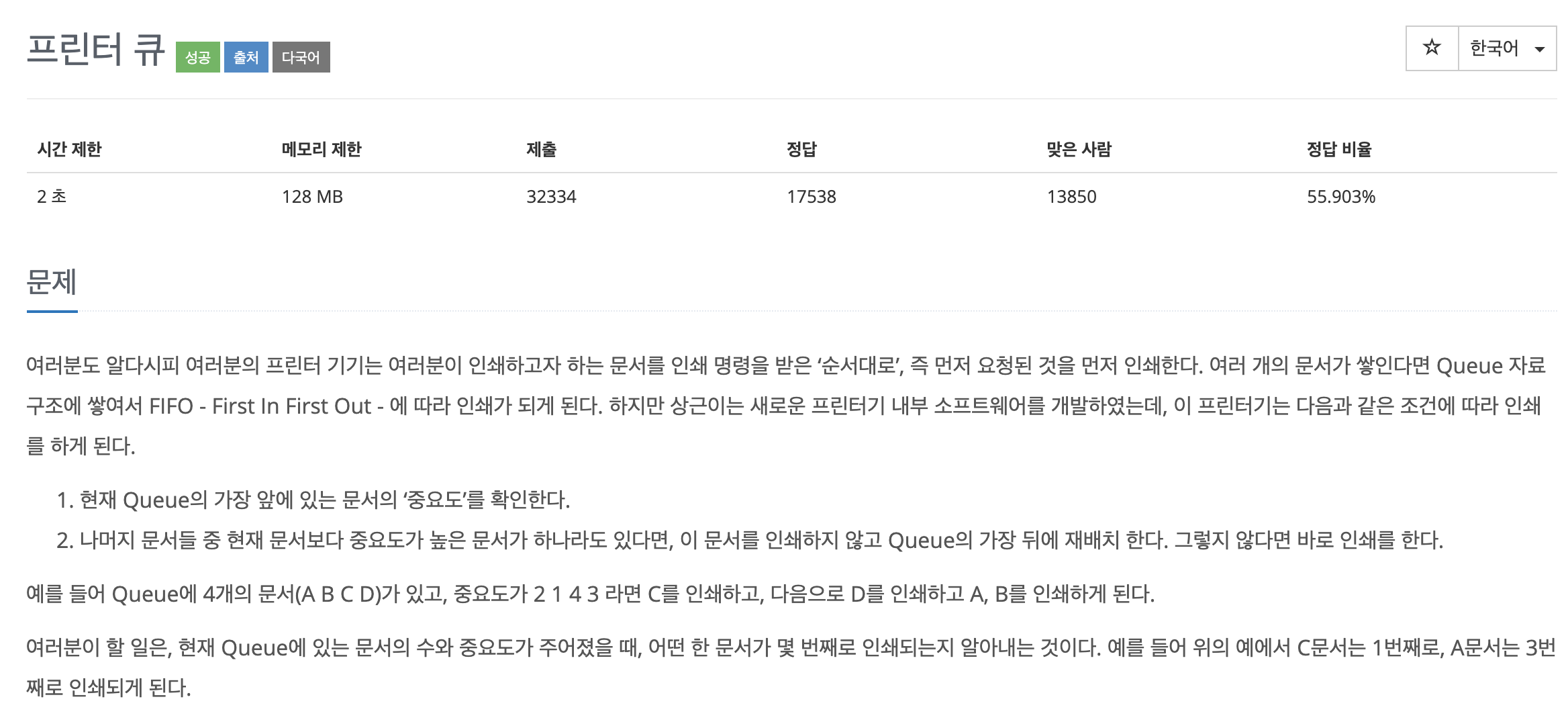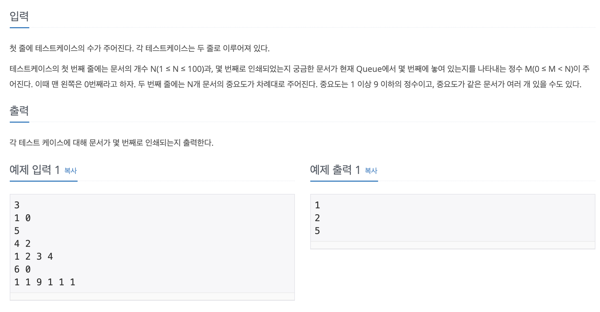 기본적인 큐의 push와 pop을 구현하면 되지만 이 문제에서는 중요도를 두어 중요도가 높은 문서가 큐에 있으면 맨 뒤로 보내기 때문에 pop을 한 뒤 다시 push를 해주면 될 것으로 보인다.