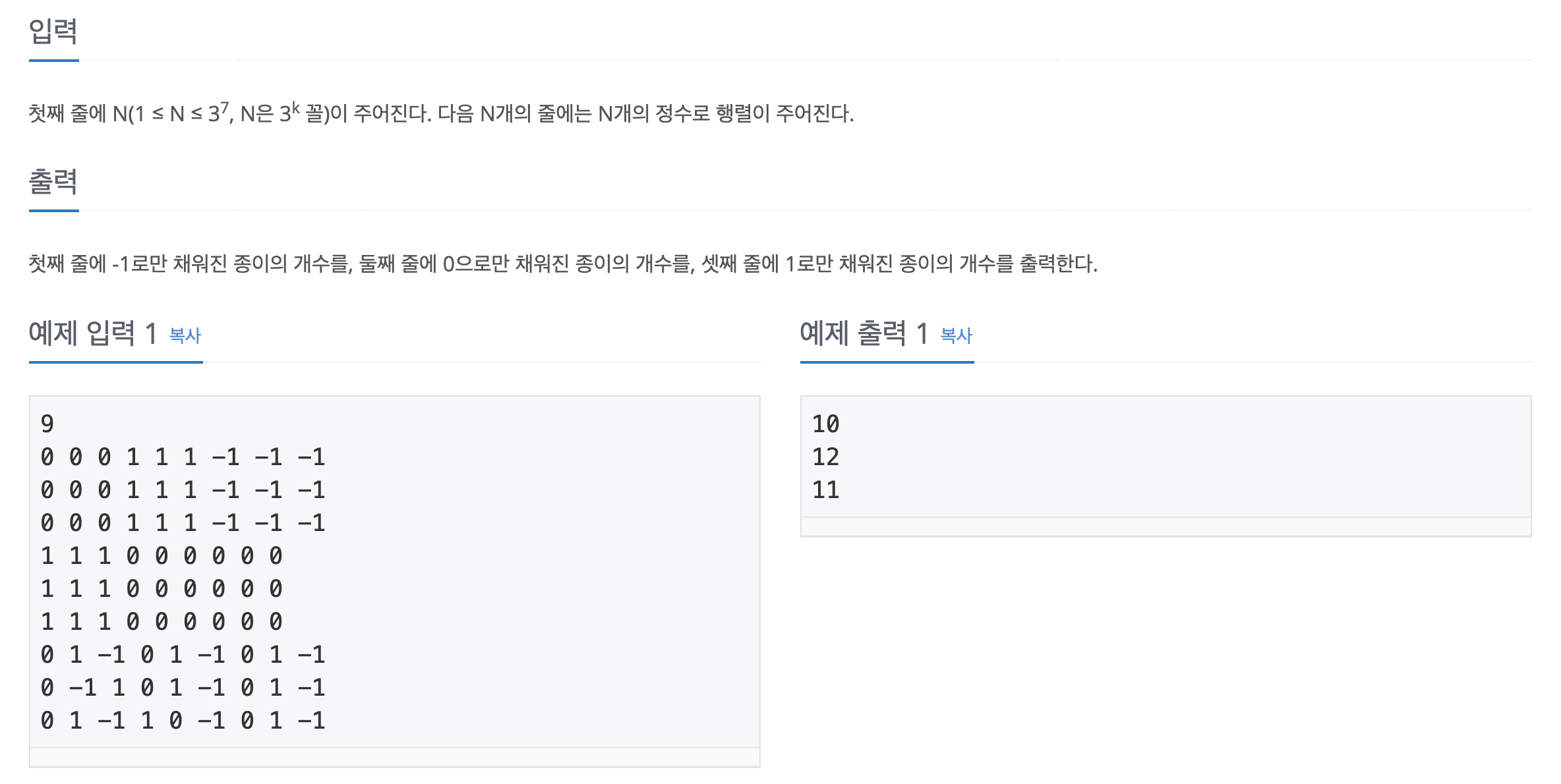 백준 2630번 색종이 만들기 문제이다. 문제는 다음과 같다. 이번 문제는 분할 정복 문제로 분류되어 있다. 분할 정복은 문제를 부분으로 나누어 푼것을 나중에 다시 합치는 것으로 재귀를 이용하