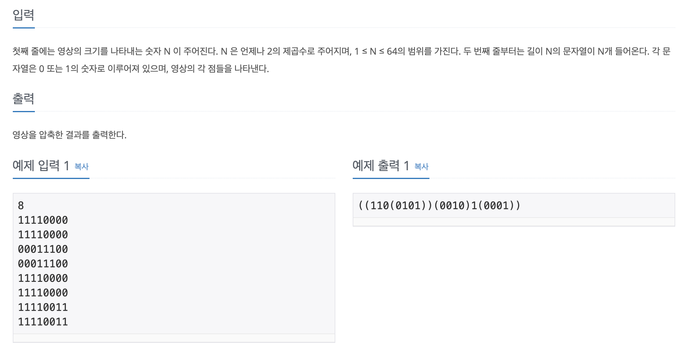 색종이 만들기와 같이 4분할을 하여 단계가 넘어가고 만약 모두 1이거나 모두 0이면 1, 0으로 표현 아니라면 4분면 각각을 숫자로 표현하는 방법이다 단계는 괄호로 구분해준다.