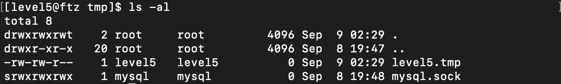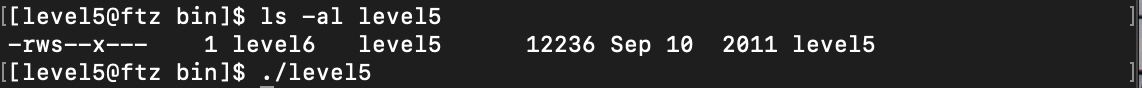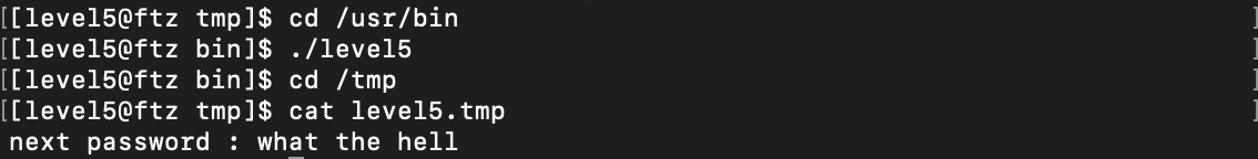 다시 level5 프로그램을 실행시키고 돌아와 임시 파일을 확인해보니 다음단계의 패스워드가 적혀있는 것을 볼 수 있었다.