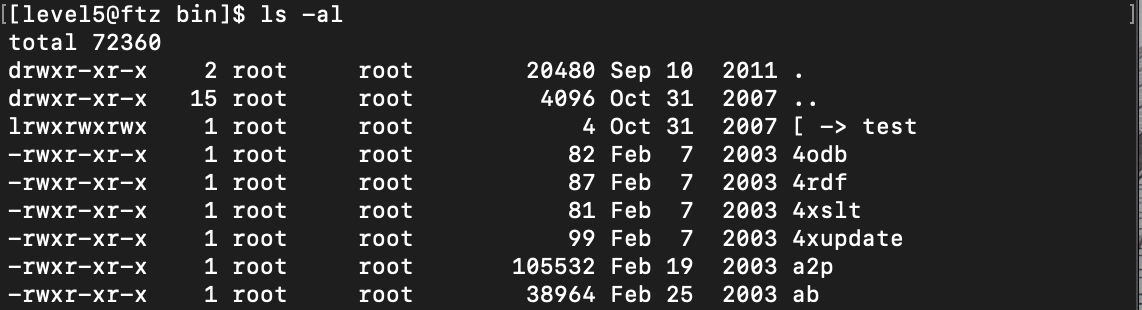 Id: level5, pw: what is your name? 으로 로그인 하고 ls 명령어를 통해 파일을 확인하였다.