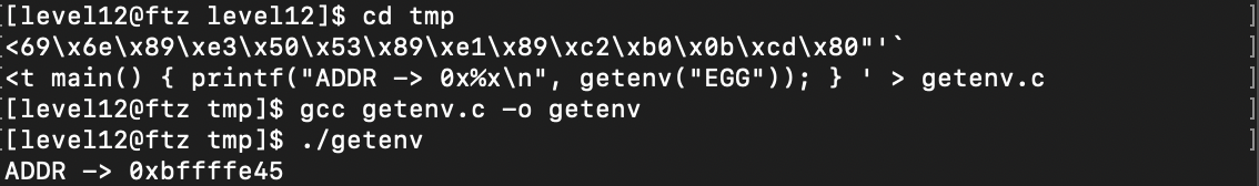 $echo 'int main() { printf("ADDR -> 0x%x\n", getenv("EGG")); } ' > getenv.c