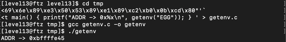 $echo 'int main() { printf("ADDR -> 0x%x\n", getenv("EGG")); } ' > getenv.c