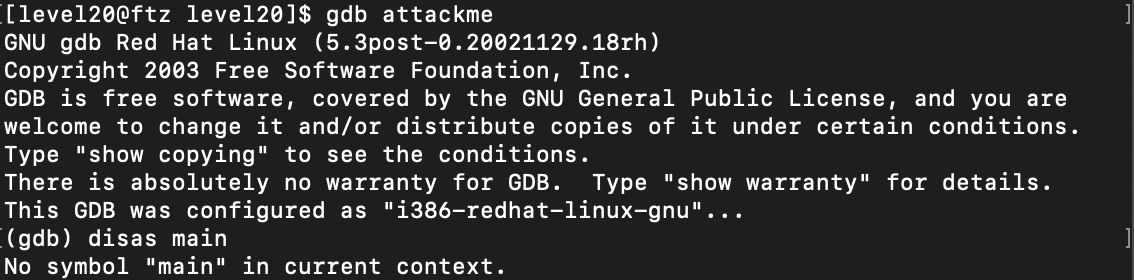 gdb를 사용해서 main함수를 살펴보려 했지만 오류가 난다.