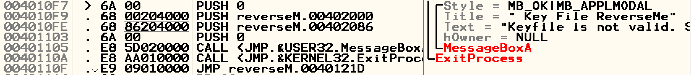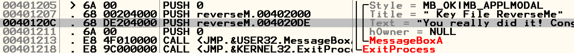 성공했을때의 창을 띄우는 부분의 주소는 00401205이다.