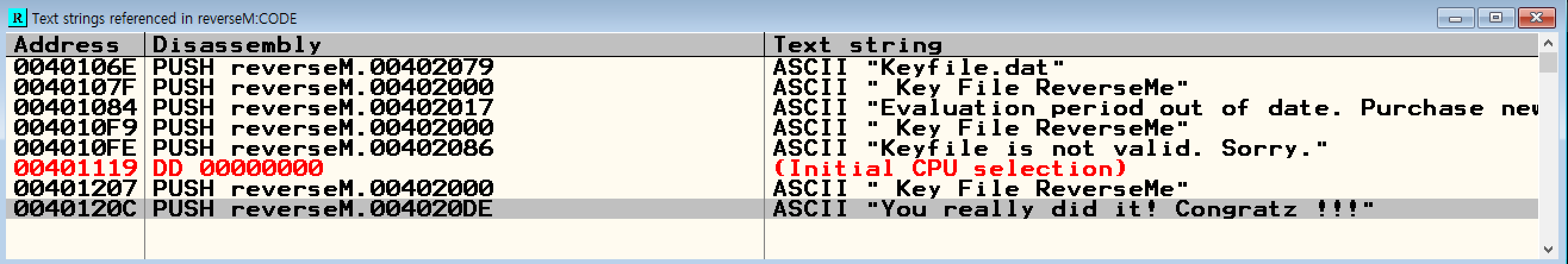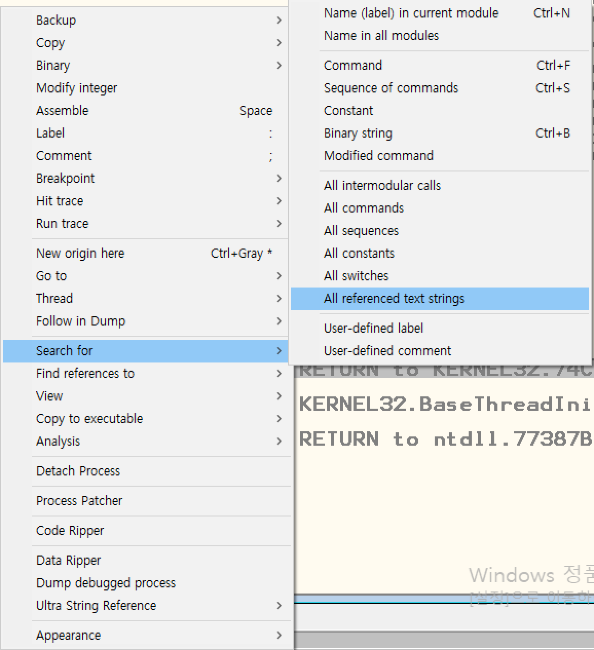 오른쪽마우스를 눌러 Search for -> All referenced text strings 를 눌러 보자