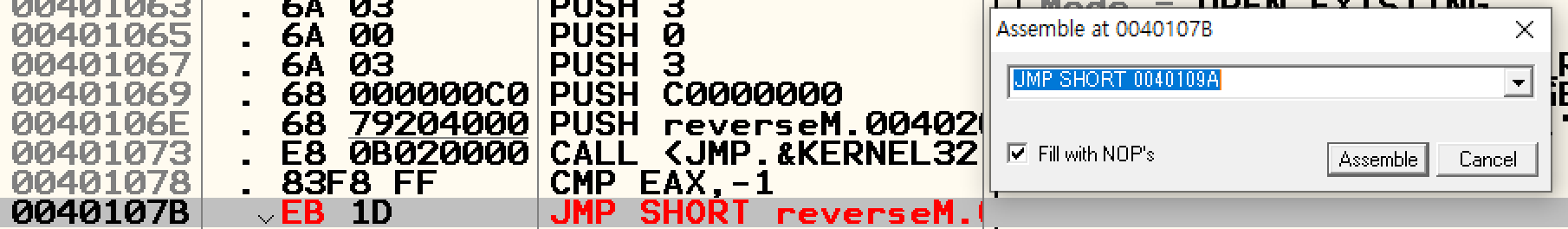 이전과 같이 JMP로 바꿔준다면 분기하는 주소가 오류를 출력하는 곳으로 되어있기 때문에 다른 방법을 사용해야 한다.