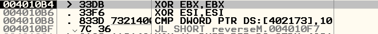 F8을 눌러가며 진행하니 402173의 메모리주소와 16진수 10을 비교하고 있다.