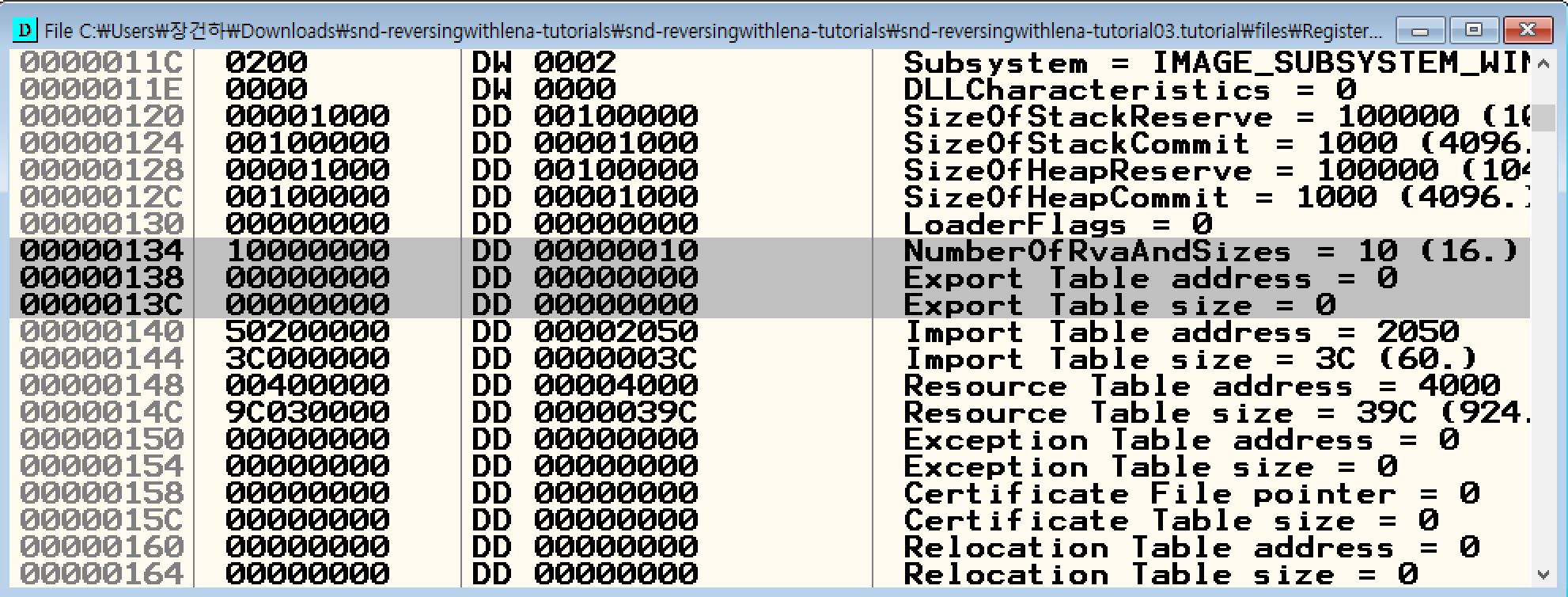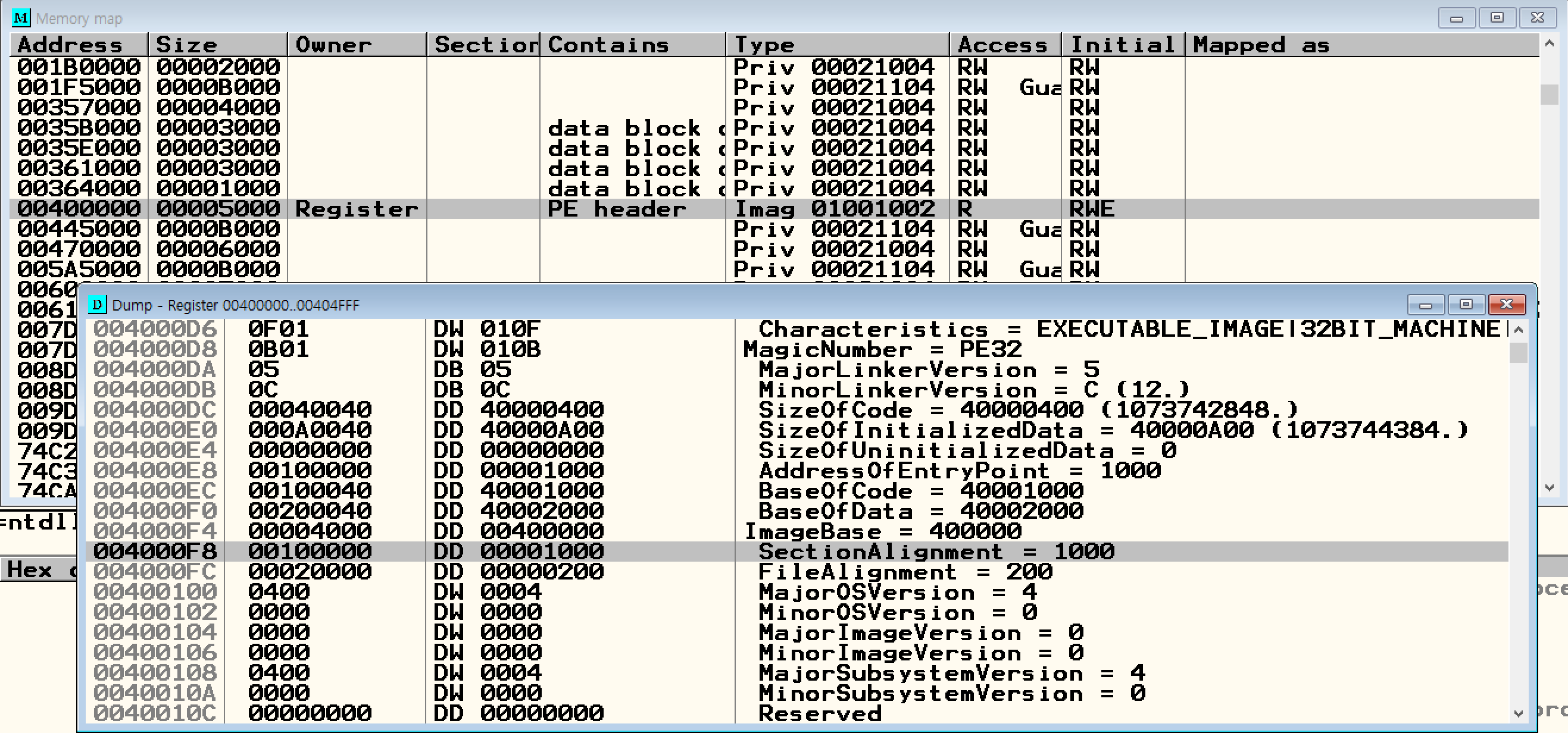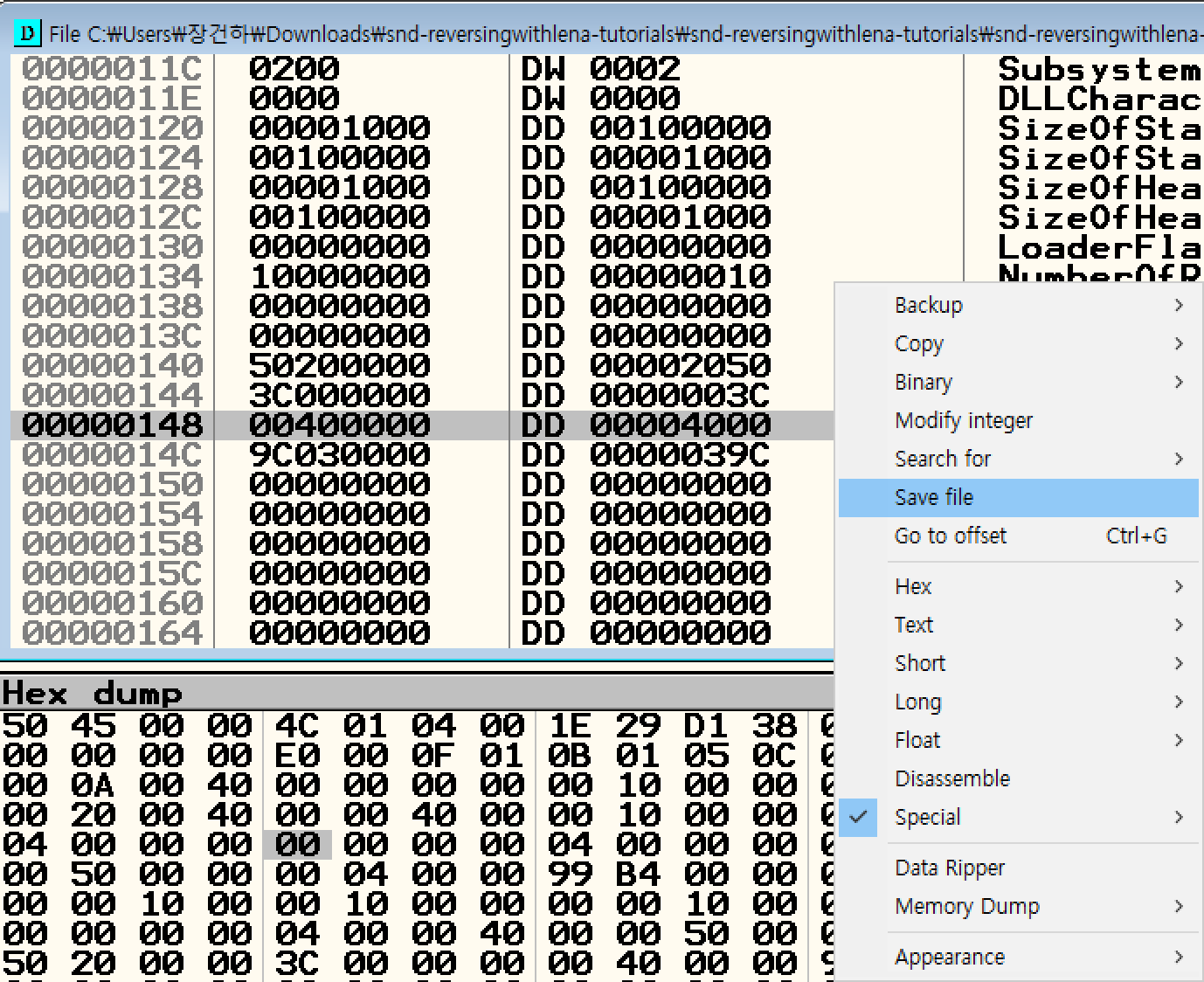 아까 보았던 PE header의 Dump를 열어 내용을 확인해보자