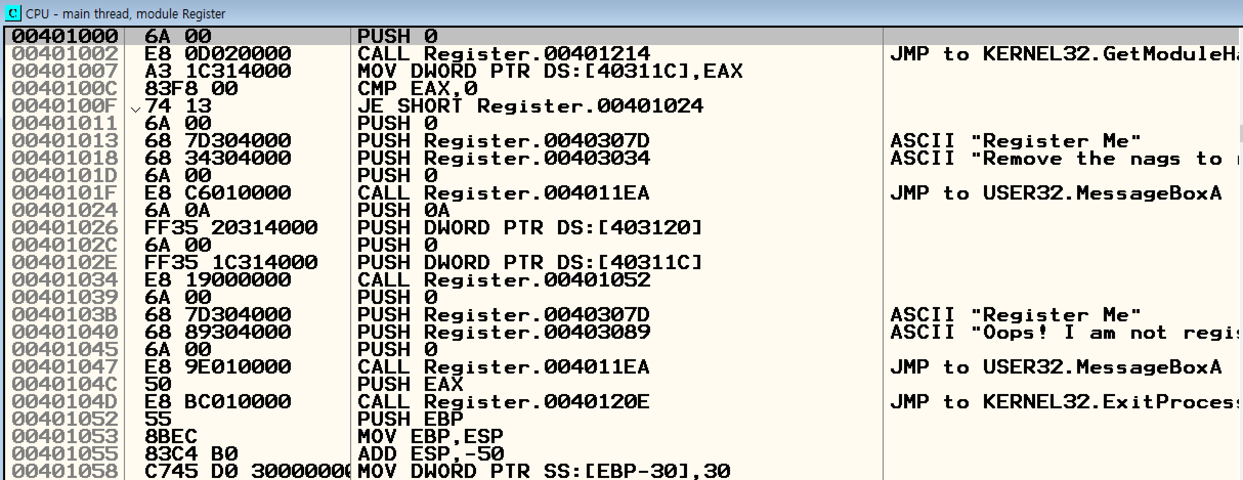 401000 주소로 이동하니 이전 RegisterMe.exe 파일과 같은 내용이 보인다.