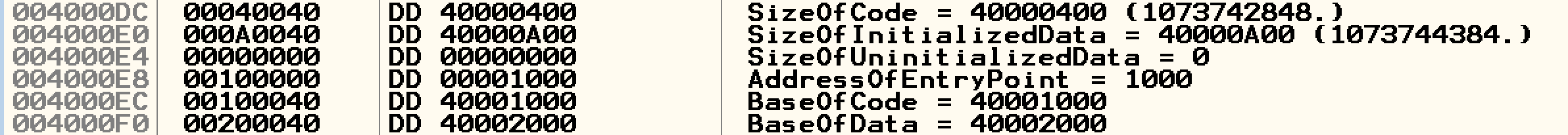 우선 SizeOfCode의 값을 400으로, SizeOfInitializedData의 값을 A00으로,