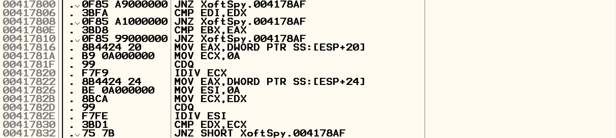 쭉 진행하다보면 JNZ 분기문이 여러개 보인다. 윗쪽에 3개 아래쪽에 1개가 존재한다.