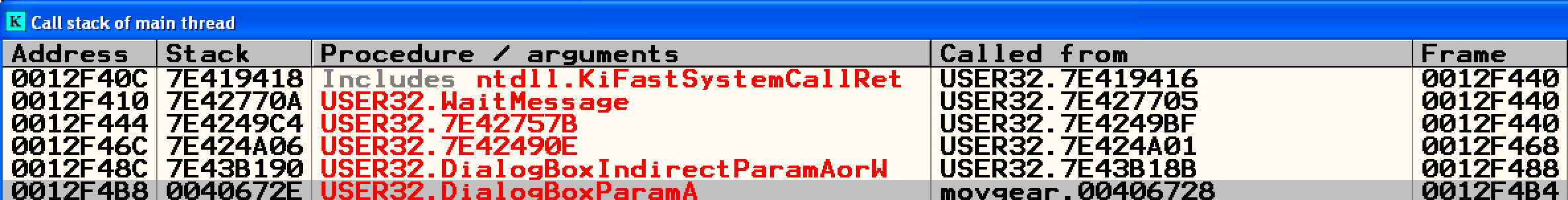 nag 창이 뜨면 F12를 눌러 일시정지 시키고 상단의 K 버튼을 눌러 Call stack을 살펴본다.