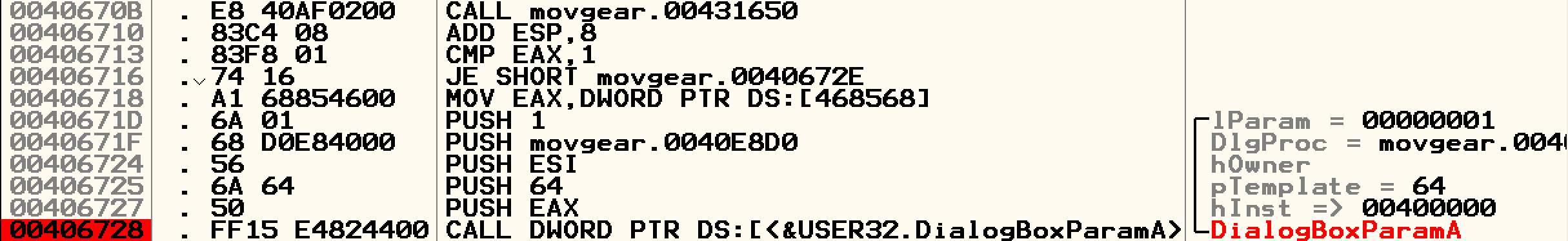 DialogBoxParamA 함수를 실행하는 곳이 nag 창을 실행하는 곳으로 보인다.