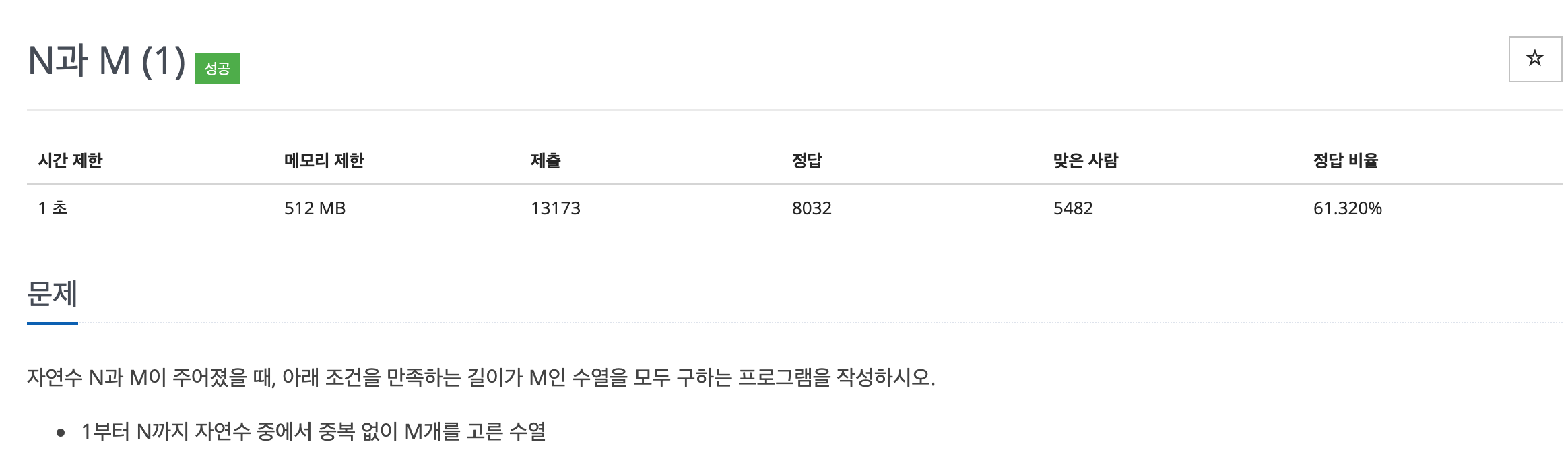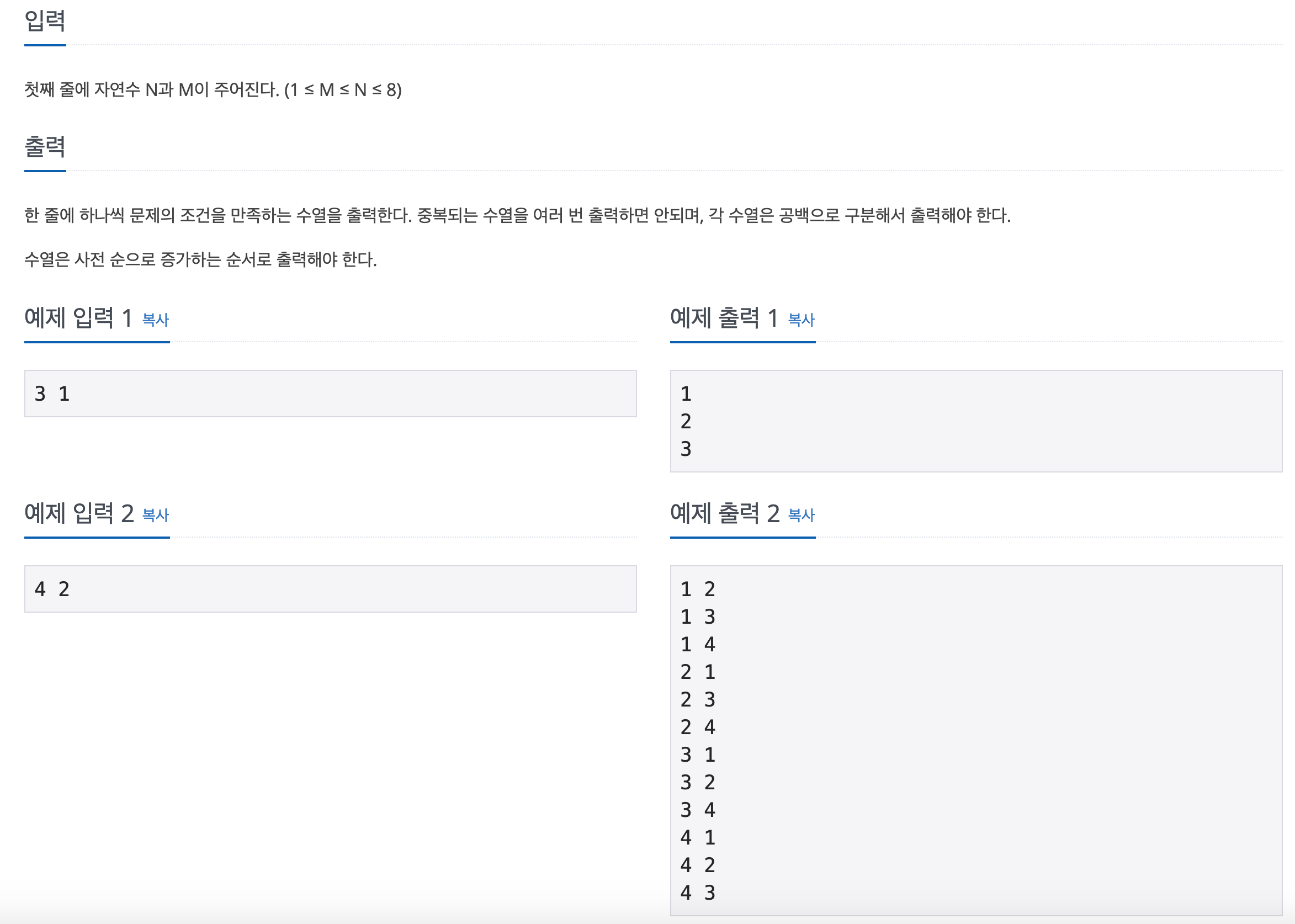 백준 15649번 N과 M (1) 문제이다.
