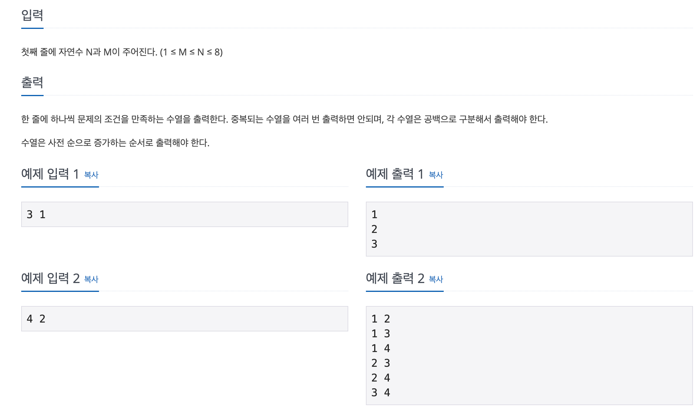 이전 N과 M (1)과 문제가 비슷하다. 이번에는 오름차순이어야 한다는 조건이 추가되었다.