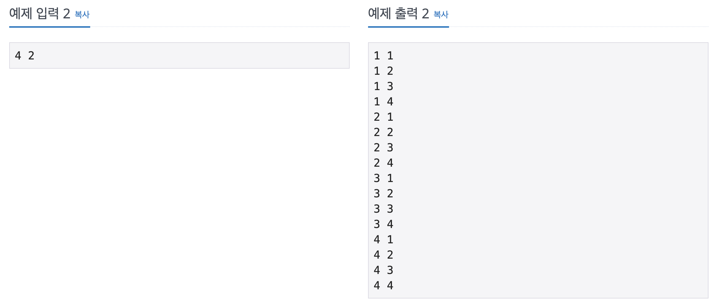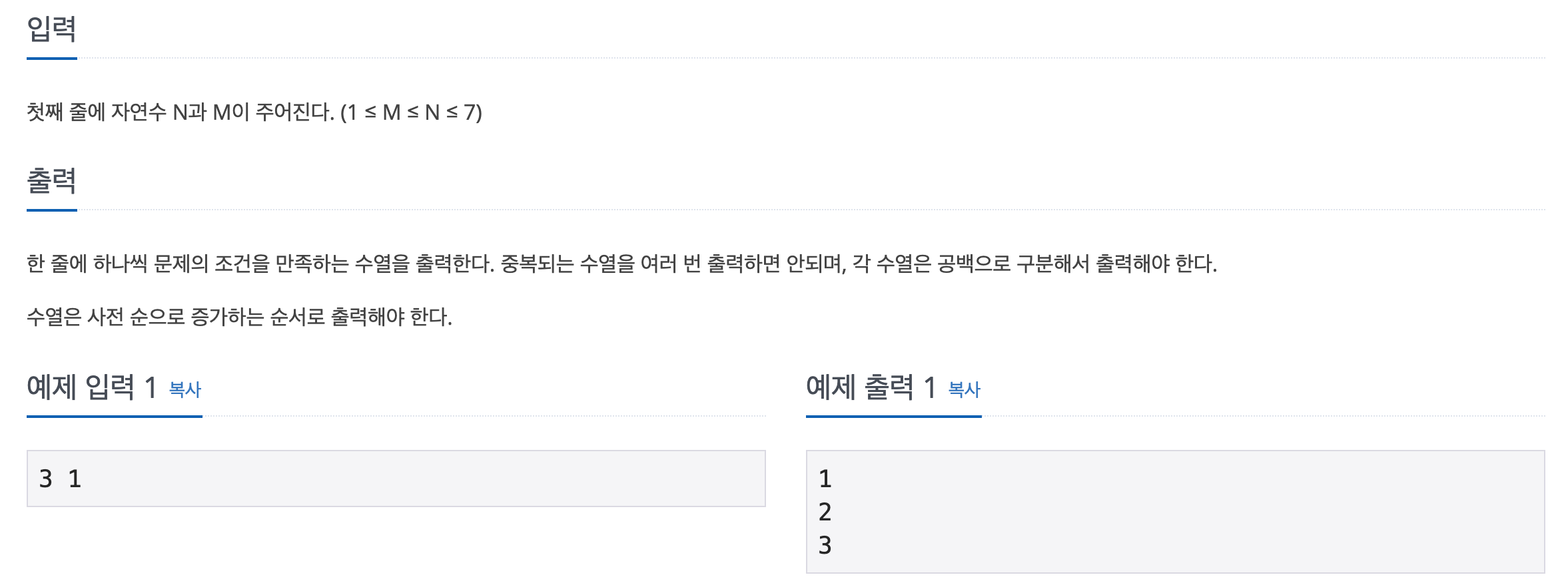 문제는 다음과 같다. 이전 N과 M 문제들과 비슷하다.
