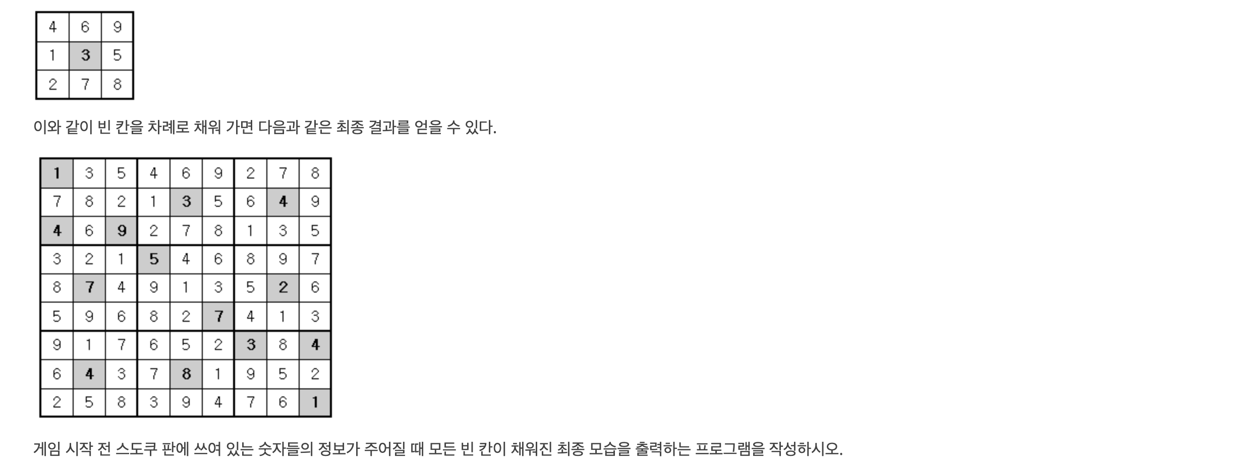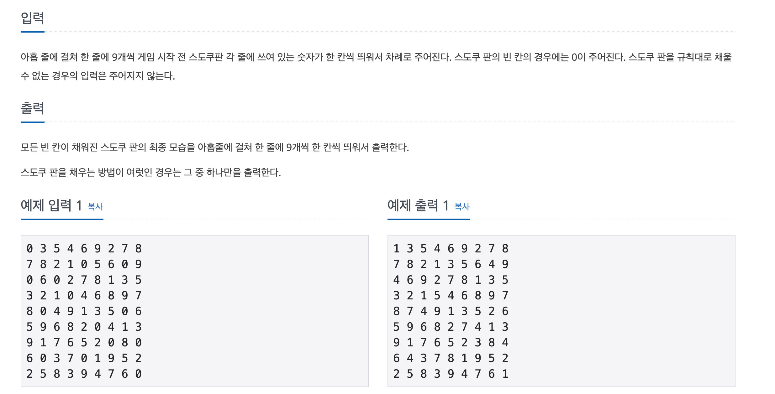 빈칸을 0으로 표시하고 있다. 빈칸에 숫자를 하나씩 넣어가면서 확인해주는 백트래킹 방식이다.
