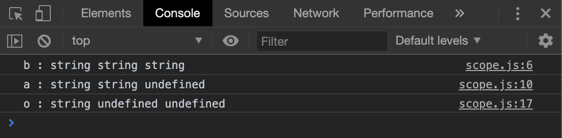 scope 유효한 영역을 의미한다. 변수의 scope 선언한 변수가 유효한 영역을 의미한다. function scope 선언된 변수는 선언된 함수 안에서만 접근이 가능하다. 선언된 함수 안에서 선언된 함수에서도 접근이 가능하다. 실습을 살펴보자 scope.html scope scope.js function a(){ var v_a="a"; function b(){ var v_b="b"; console.log("b :", typeof(v), typeof(v_a), typeof(v_b)); } b(); console.log("a :", typeof(v), typeof(v_a), typeof(v_b)); } var v="v"; a(); console.log("o :", typeof(v), typeof(v_a),..