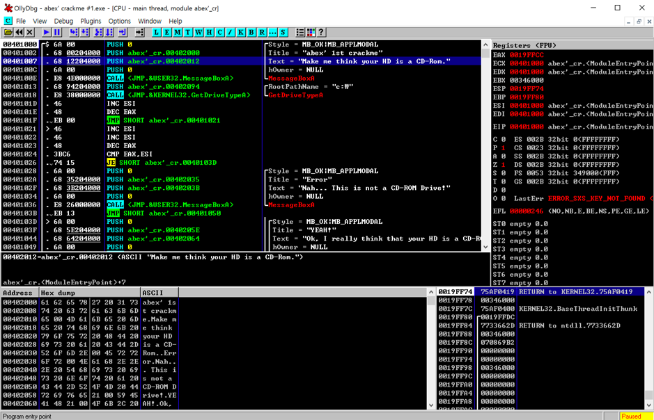 해당 파일을 Ollydbg에 올려보면 다음과 같이 나온다.