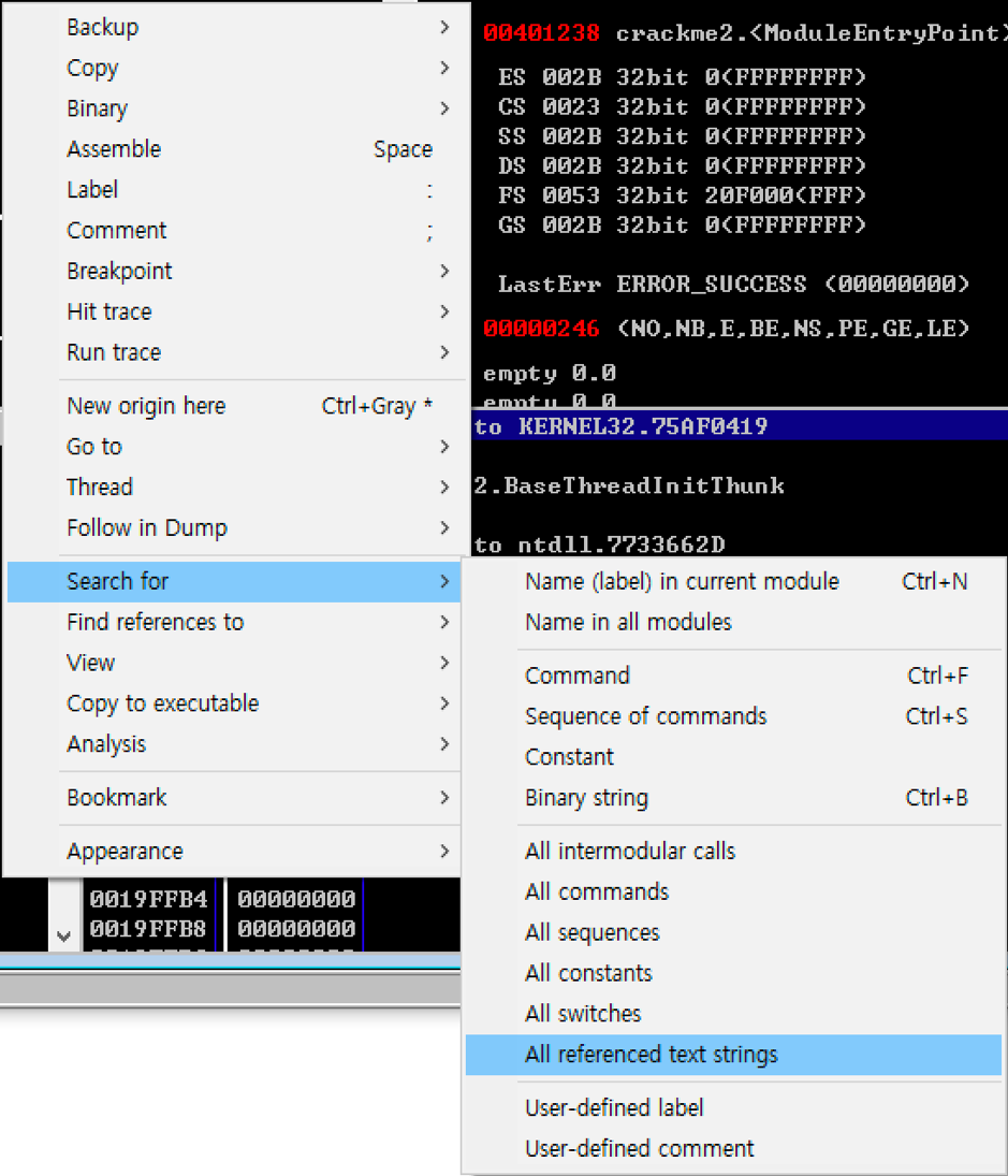 오른쪽 마우스를 눌러 Search for -> All referenced text strings를 눌러준다.