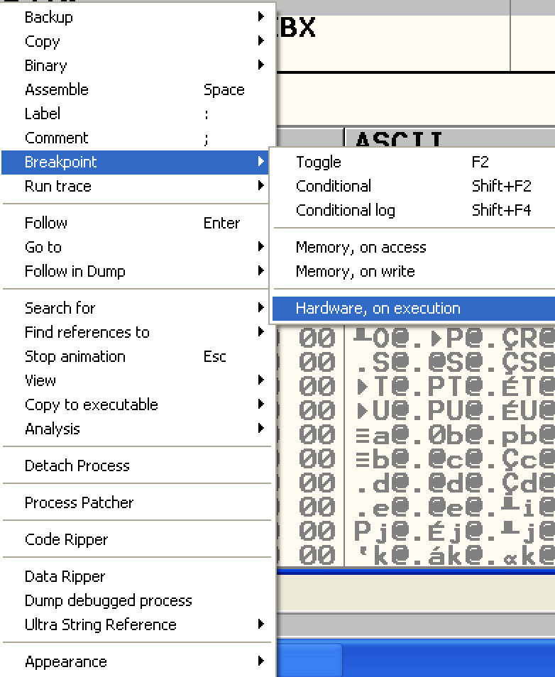해당 줄의 오른쪽 마우스를 눌러 Breakpoint -> Hardware, on execution을 눌러준다.