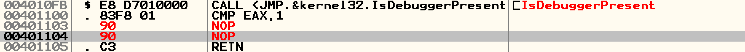 디버깅 중이면 분기하는 부분을 NOP 처리해준다.