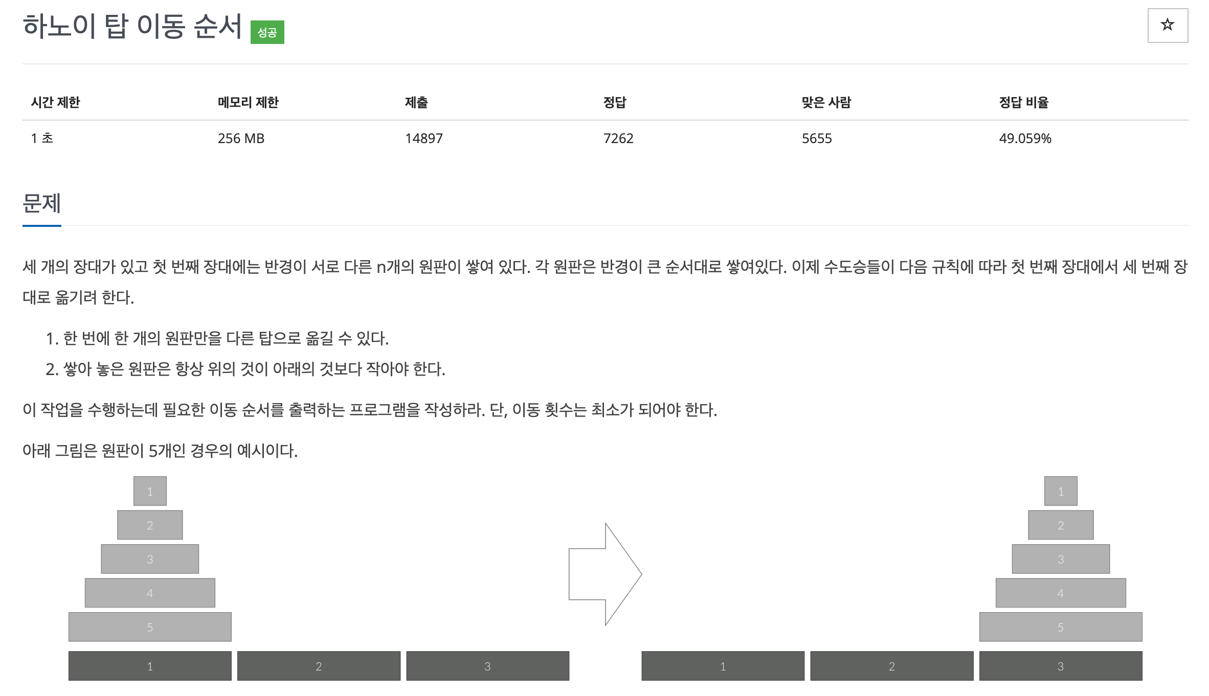 백준 11729번 재귀로 유명한 하노이의 탑 문제이다. 문제는 다음과 같다. 일반적인 하노이의 탑 문제이다. 입력값과 출력값, 예제가 주어져 있다. 출력은 총 움직인 횟수를 먼저 출력하고 움직임을 하나씩 출력하도록 되어있다. 언어는 ruby를 사용하여 프로그래밍 하였다. def move(n,st,en,si) if n == 2 puts "%d %d" %[st, si] puts "%d %d" %[st, en] puts "%d %d" %[si, en] return end move(n-1, st, si, en) puts "%d %d" %[st, en] move(n-1, si, en, st) end a = gets() a = a.to_i sum = 1 for i in 0...a-1 sum = sum * 2 + 1..